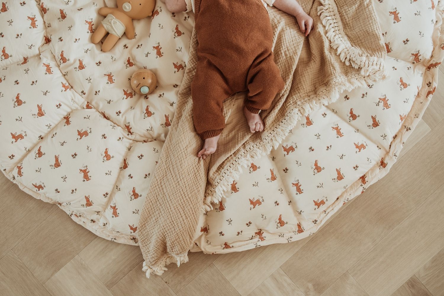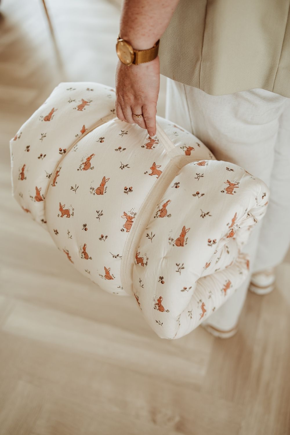 De Bloom Rabbit is een prachtige 3-in-1 speelmat die ontworpen is om met je kindje mee te groeien. Wanneer de bloemblaadjes omhoog staan, vormen ze een knus ligbed met zachte, beschermende randen om je baby veilig te houden. Vouw de blaadjes uit en de speelmat opent zich, waardoor een ruime, zachte speelruimte ontstaat, perfect voor speeltijd op de buik, gecontroleerd spelen en verkennen. De Bloom Rabbit is niet alleen functioneel, maar ook charmant als decoratief element in een kinderkamer of speelkamer, waar de favoriete speeltjes van je kleintje netjes worden opgeborgen.