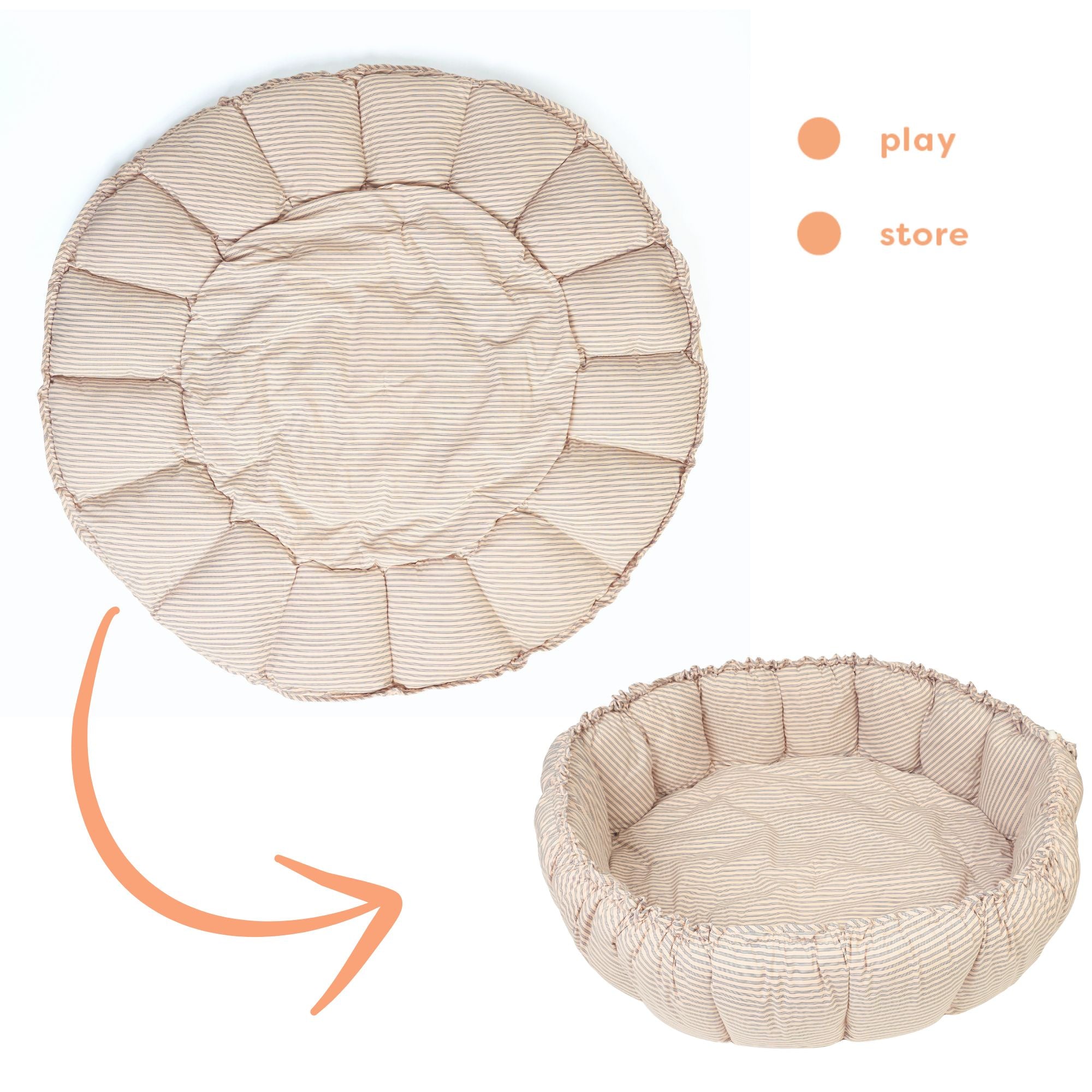De Bloom Stripes Blue is een betoverende 3-in-1 speelmat die meegroeit met je kleintje. Wanneer de blauw gestreepte zijkanten omhoog staan, vormen ze een knus ligbed met zachte, beschermende randen om je baby veilig te houden. Laat de zijkanten zakken en de speelmat ontvouwt zich tot een ruime, zachte speelruimte, perfect voor speeltijd op de buik, gecontroleerd spelen en verkennen. De Bloom is niet alleen functioneel, maar ook een stijlvolle toevoeging aan elke kinderkamer of speelkamer, waar de favoriete speeltjes van je kind netjes op één plek worden opgeborgen.